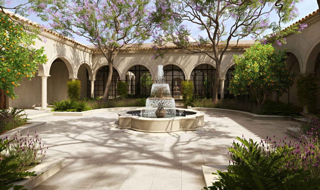 Con el perfume de los azares nos recibe un antiguo patio andaluz, con influencias de la arquitectura mediterránea, descubriendo un amplio espacio de belleza, con música serena de agua corriendo, con la brisa fresca viajando en galerías, con el murmullo del viento acariciando las hojas de los Jacaranda.