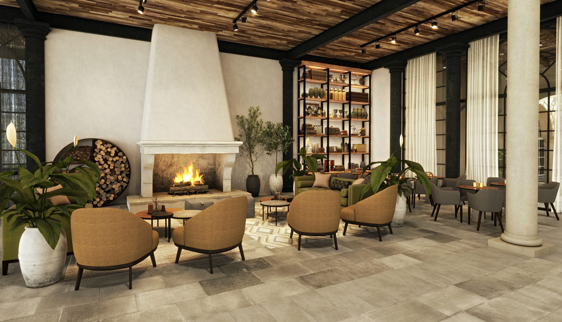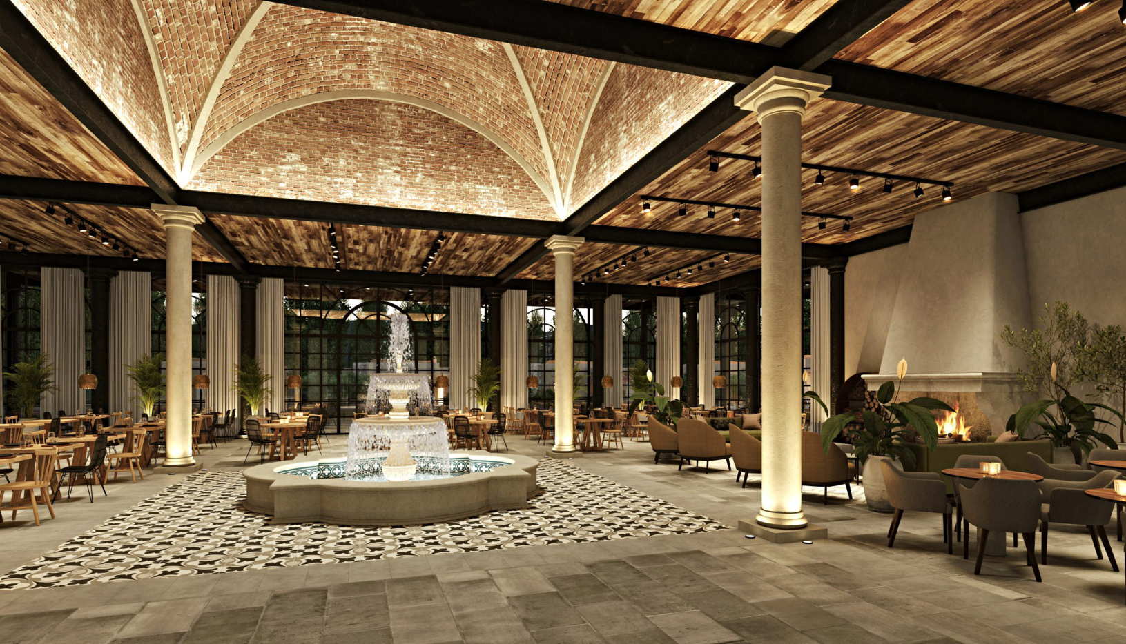 Un magnificó cielorraso confeccionado con el roble de viejos toneles para definir el sonido del agua danzante en una fuente interior. un espacio donde todo sucede.